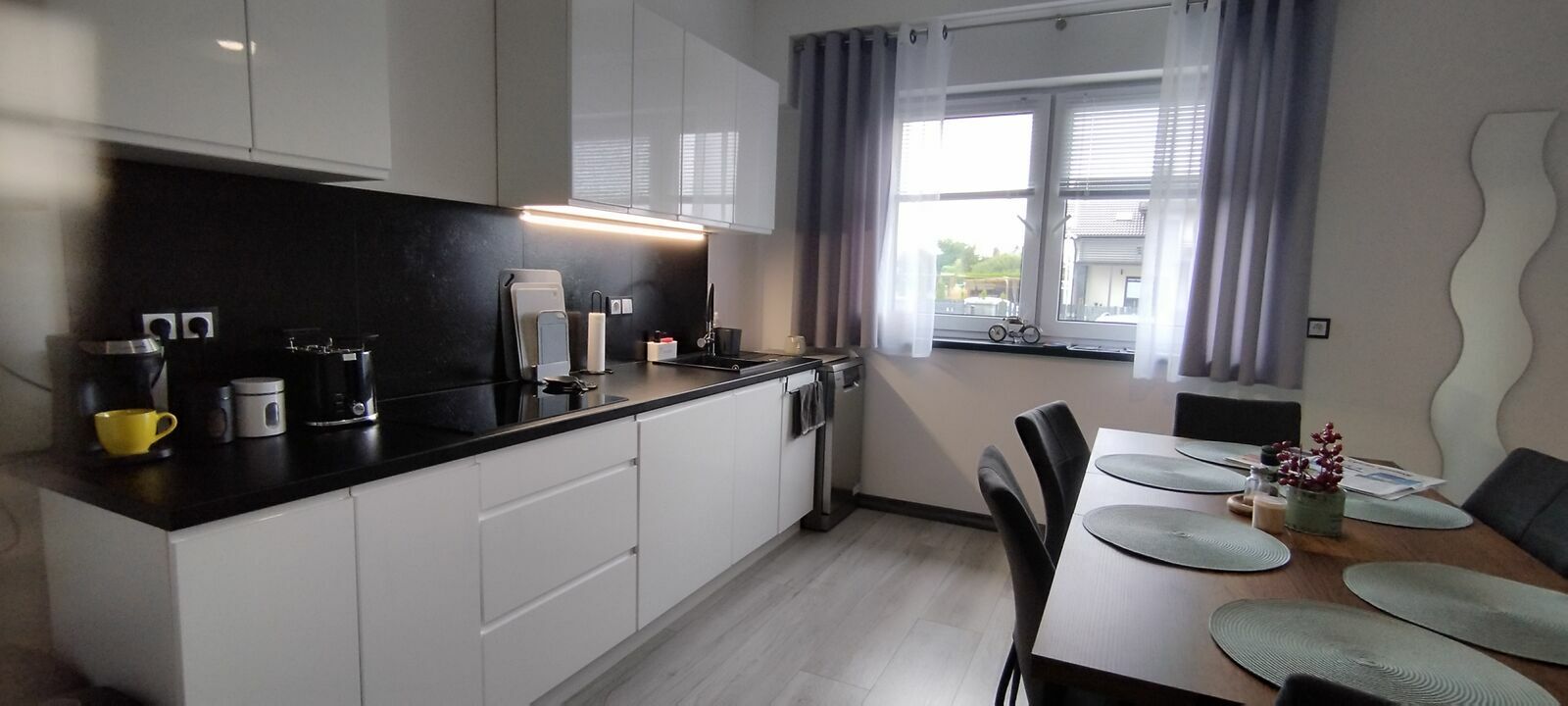 W kuchni znajdują się m.in.: ekspres do kawy, zmywarka, mikrofalówka oraz niezbędne akcesoria kuchenne.